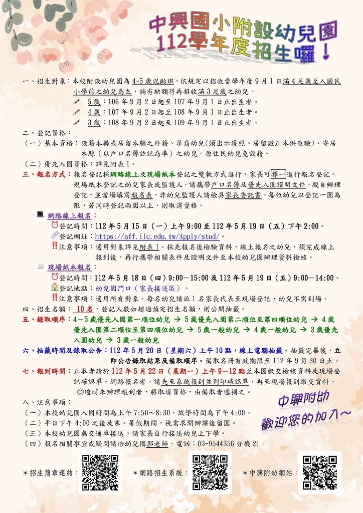 中興附幼112學年度開始招生囉!